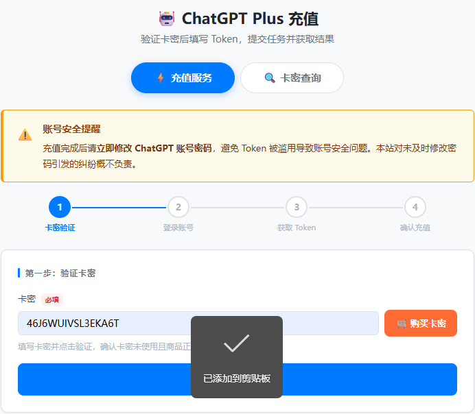 输入卡密并点击「验证卡密」,确认卡密未使用且商品正确。